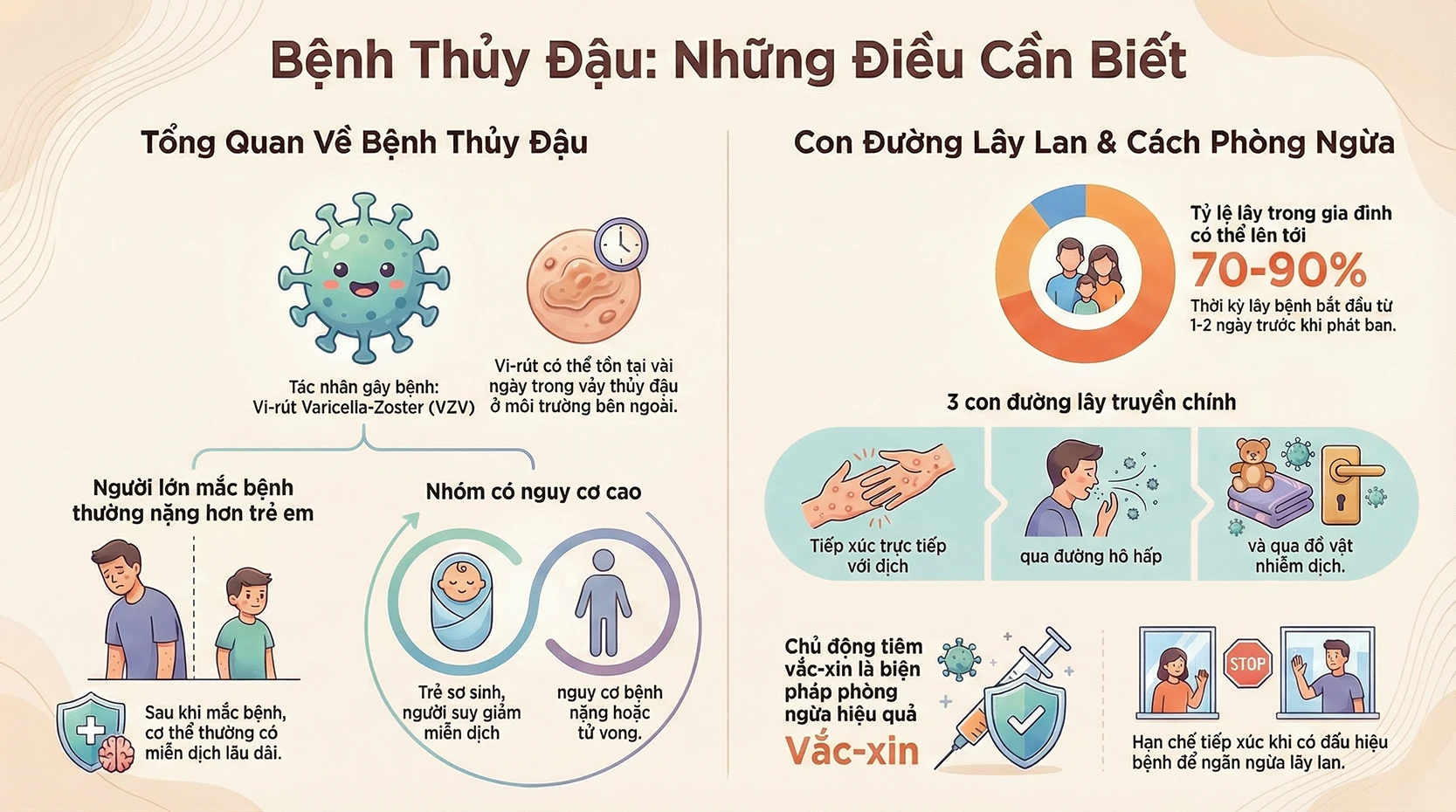 Bệnh thủy đậu (Chickenpox) là bệnh truyền nhiễm cấp tính thuộc nhóm B, thường gặp vào mùa đông và đầu xuân, dễ lây lan trong cộng đồng. Bệnh khởi phát với sốt nhẹ, sau đó xuất hiện phát ban dạng nốt sần – bọng nước – vảy, mọc thành nhiều đợt trên cùng một vùng da.