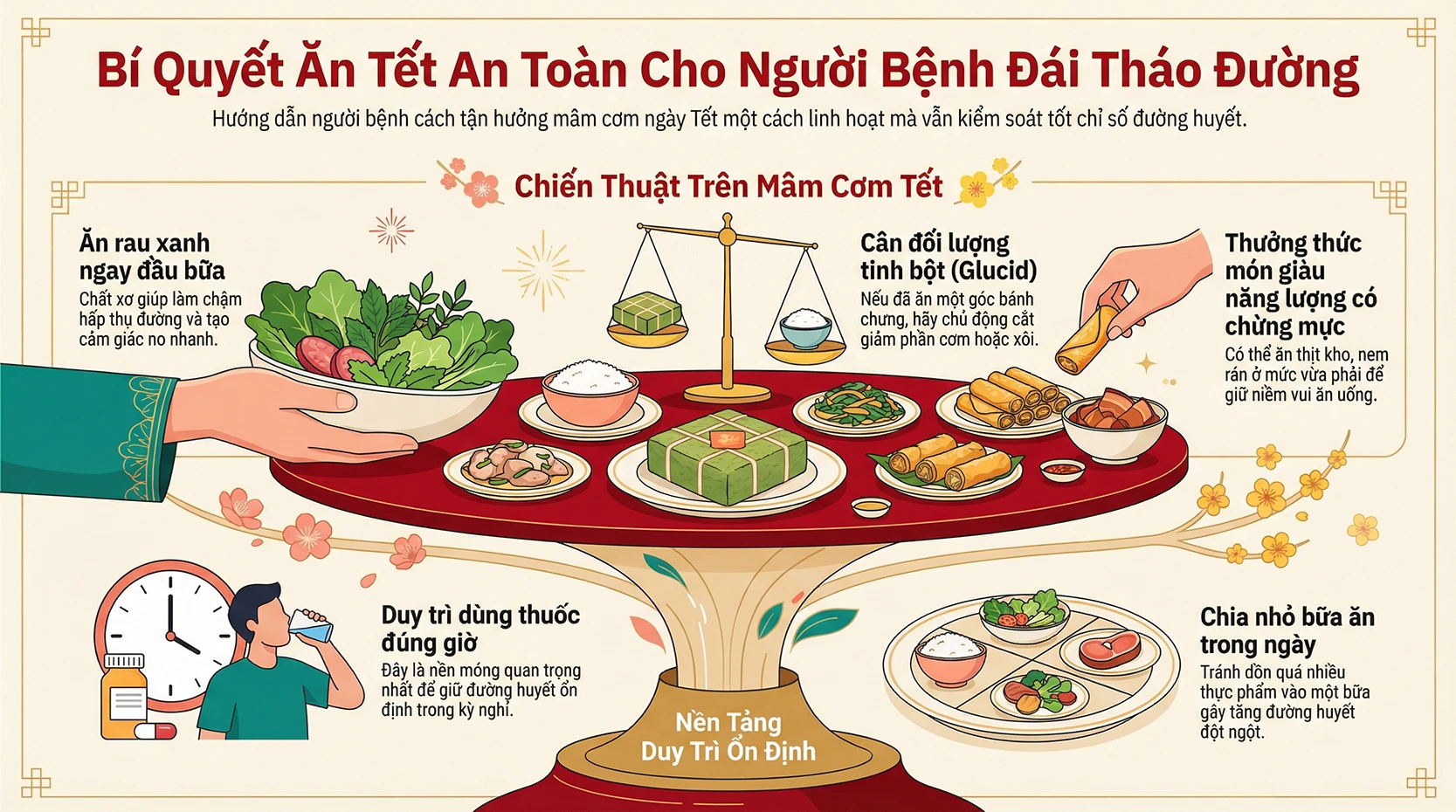 Mỗi dịp Tết đến xuân về, mâm cơm với bánh chưng xanh, thịt đông hay đĩa nem rán vàng ruộm là nét đặc trưng của sự đoàn viên, sum họp trong mỗi gia đình Việt Nam. Thế nhưng, với những người đang chung sống cùng bệnh đái tháo đường, những món ăn truyền thống này đôi khi lại trở thành một nguồn áp lực âm thầm.