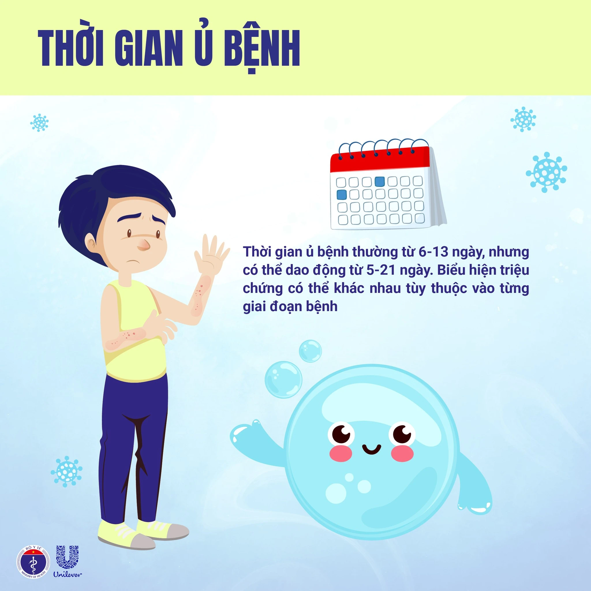 Thời gian ủ bệnh thường 6–13 ngày, có thể 5–21 ngày.