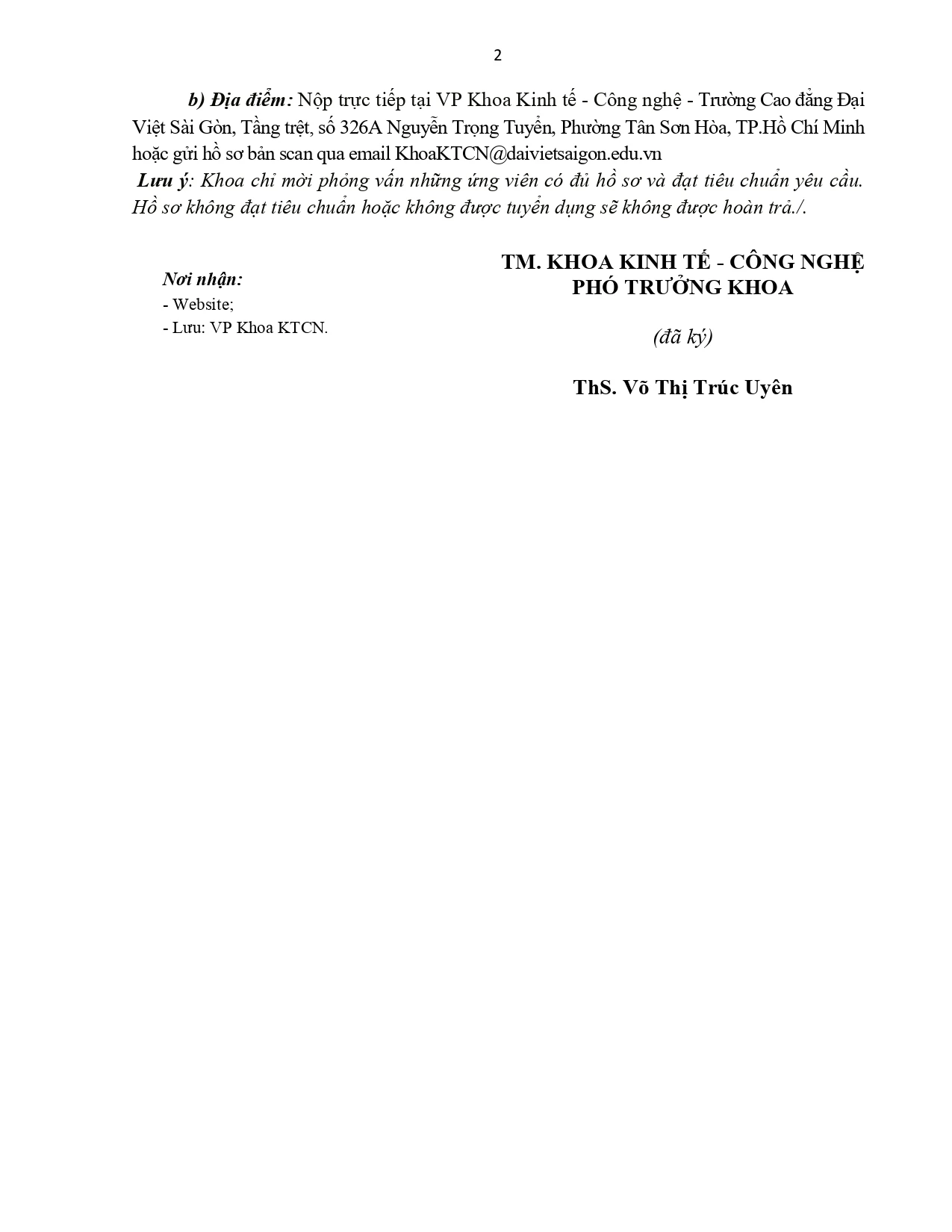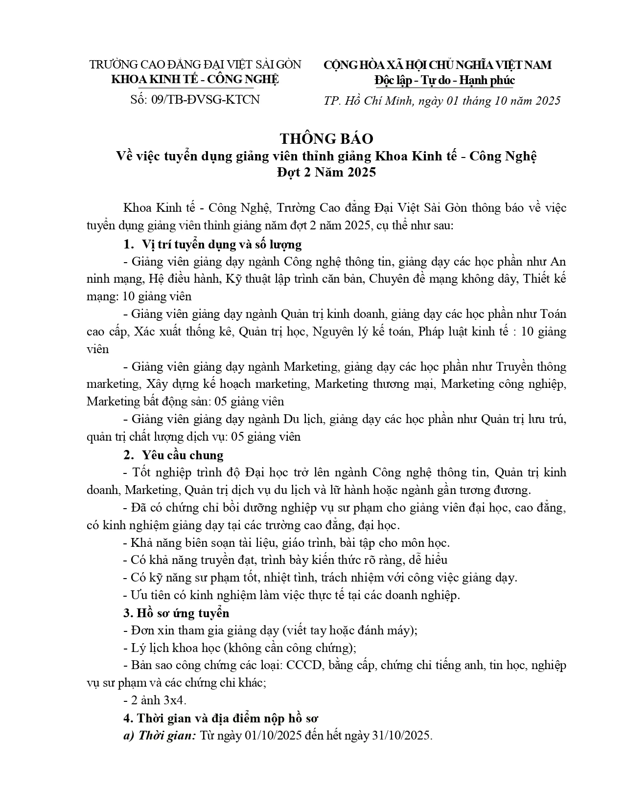 Khoa Kinh tế - Công Nghệ, Trường Cao đẳng Đại Việt Sài Gòn thông báo về việc tuyển dụng giảng viên thỉnh giảng năm đợt 2 năm 2025: